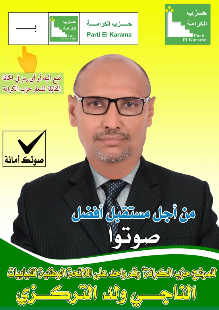 اختار حزب الكرامة الإطار والوجيه الاجتماعي الناجي ولد التركزي مرشحا للحزب علي اللائحة الوطنية للحزب في استحققات الانتخابية فاتح الشهر المقبل.